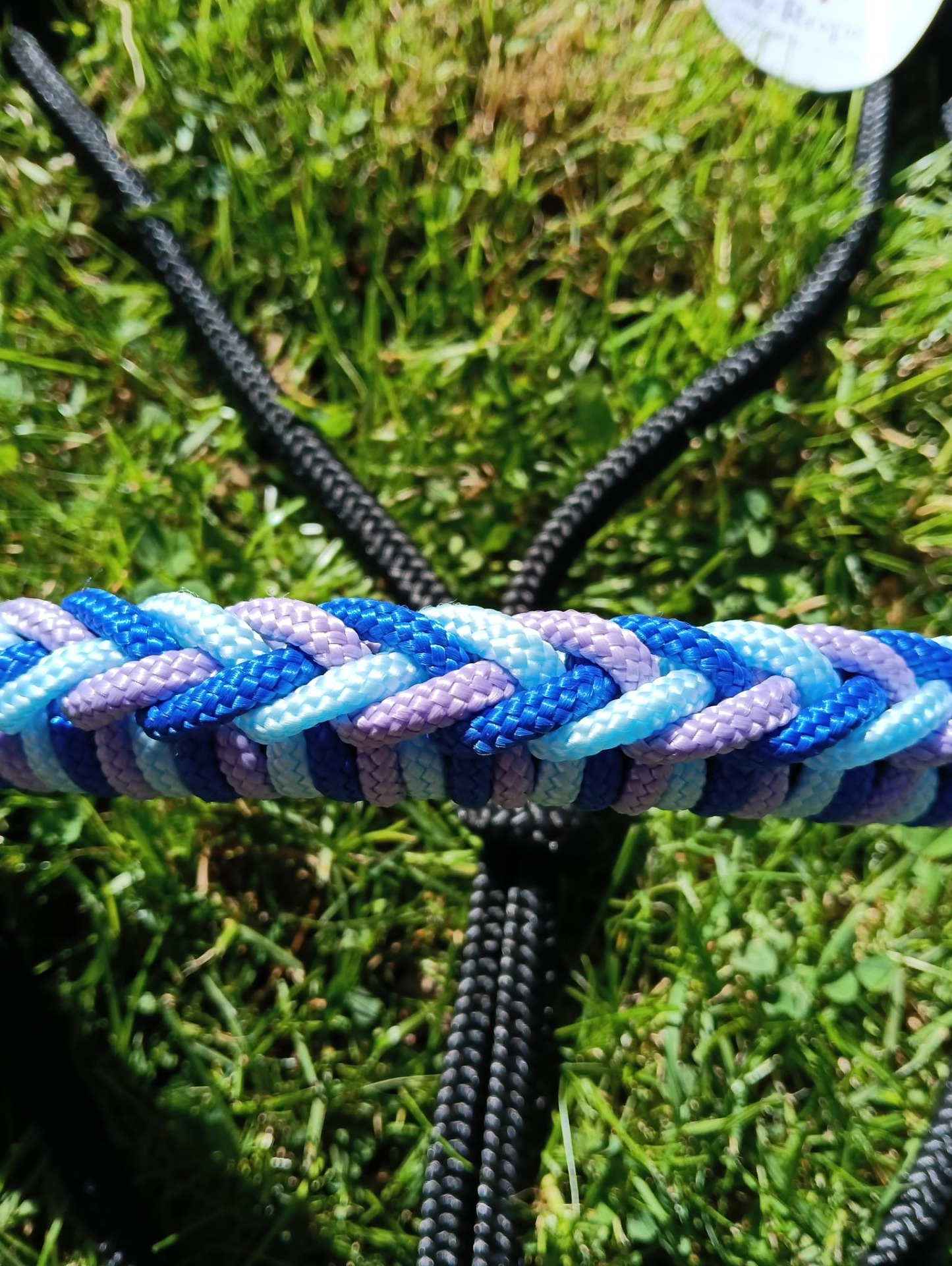 8mm zwart touwhalster met vlecht neusband in de kleuren royal blauw, lila en lichtblauw.