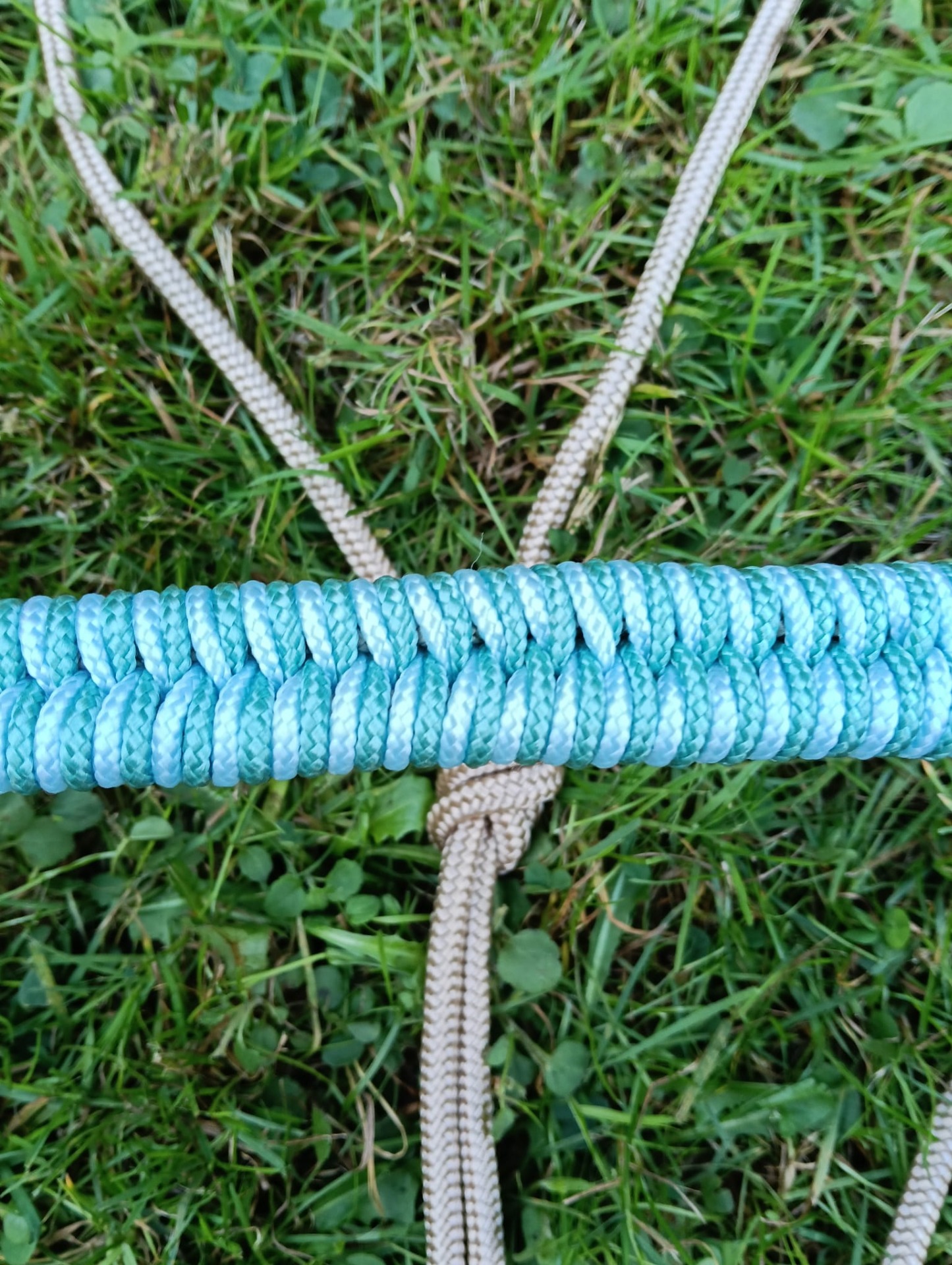 6mm beige touwhalster met visgraat neusband in de kleuren lichtblauw en zeegroen.