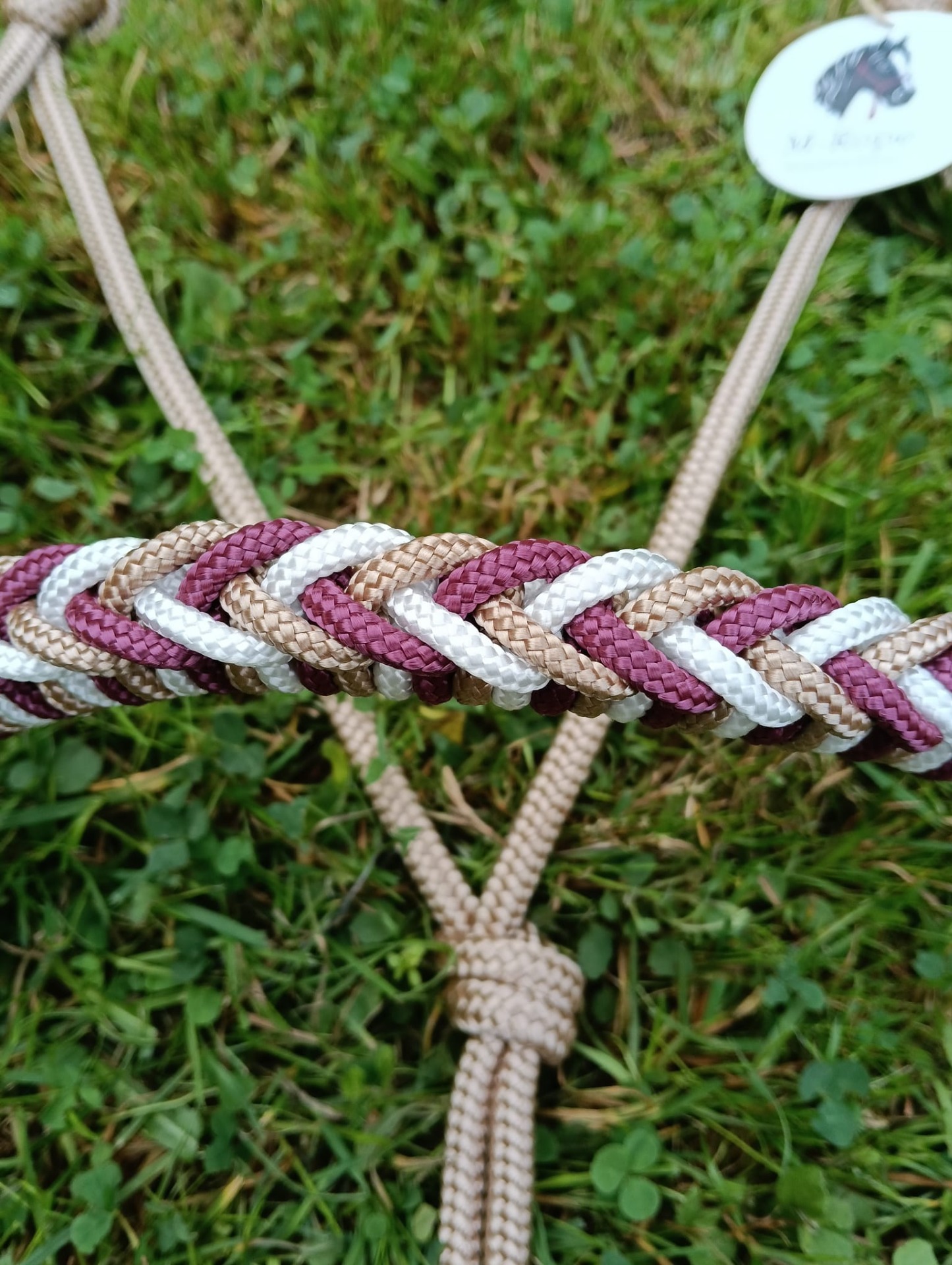 8mm beige touwhalster met vlecht neusband in de kleuren beige, wit en geroosterd bordeaux.