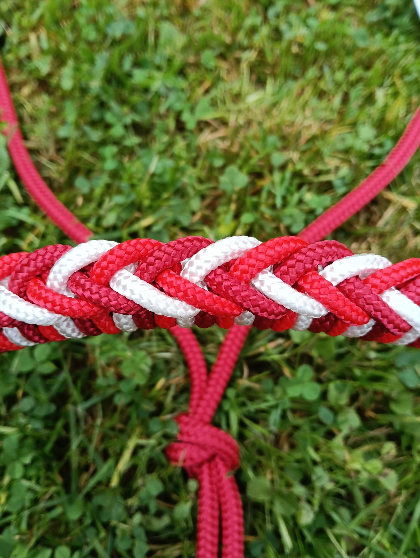 8mm framboos touwhalster met vlecht neusband in de kleuren rood, framboos en wit.
